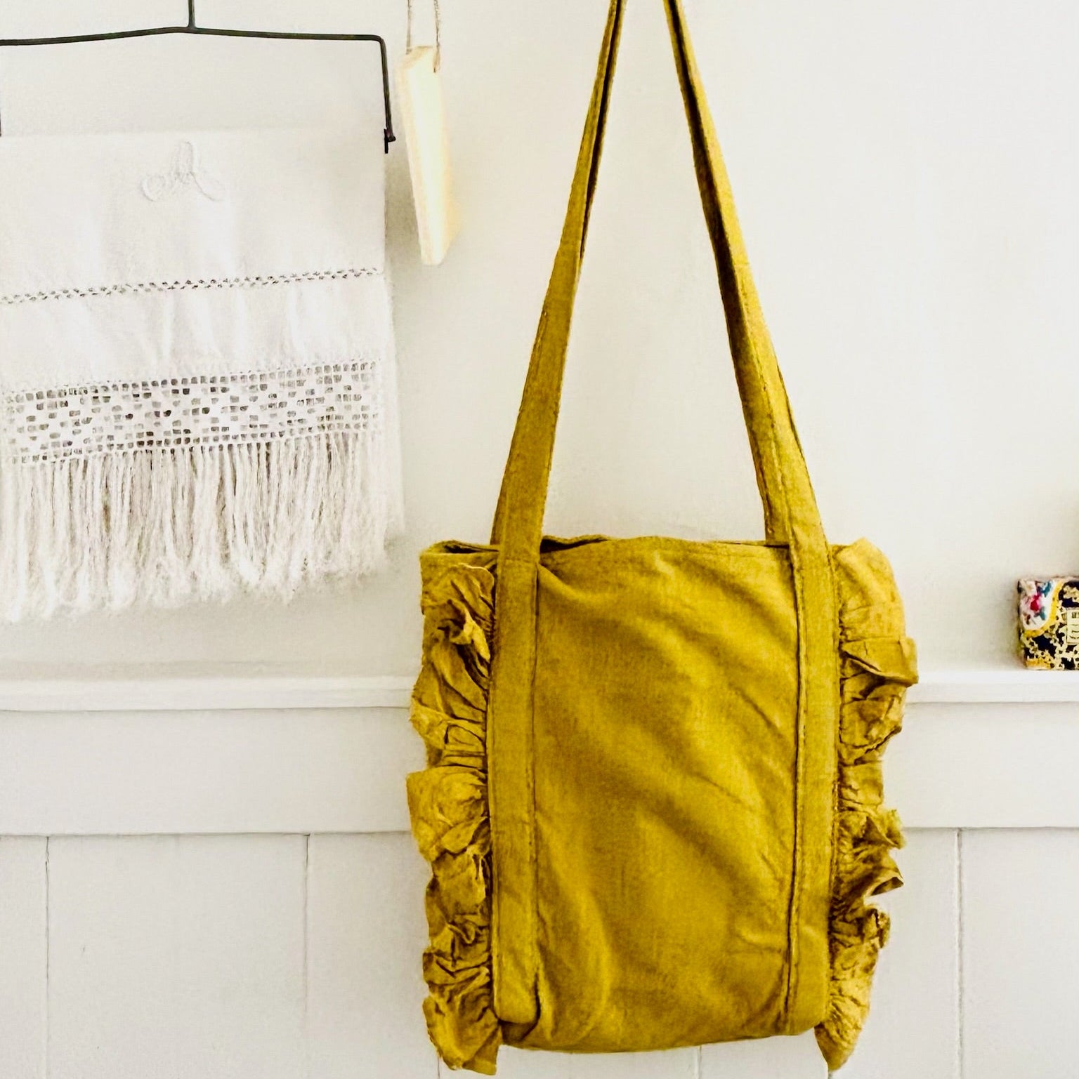 Bag Lady Linen Tote with fabulous frills. Snap closure and inside zip pocket. Strong, beautiful, natural fabric, washable.