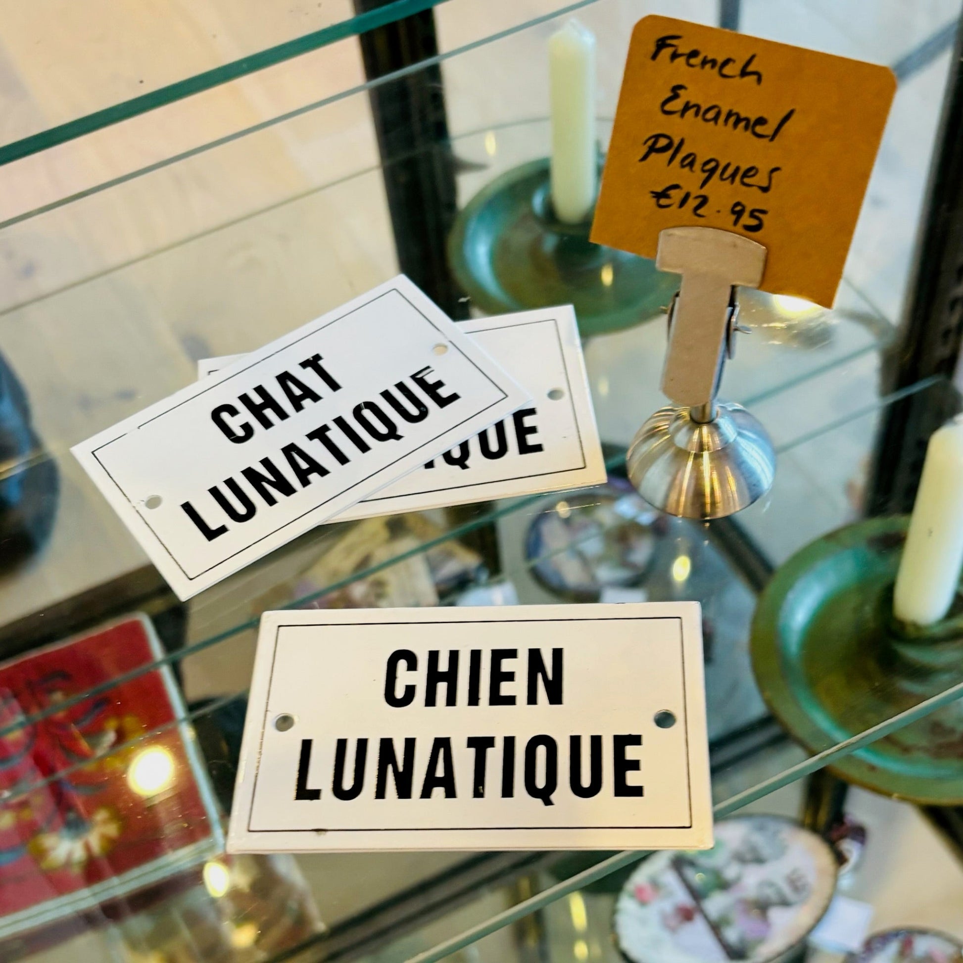 If you have a Chien Lunatique or Chat Lunatique (aren't they all?) - or at least you'd like to let on you do - then, say no more. Tell, don't show. Punchy French enamel signs to add a smile to any postie's tentative arrival.