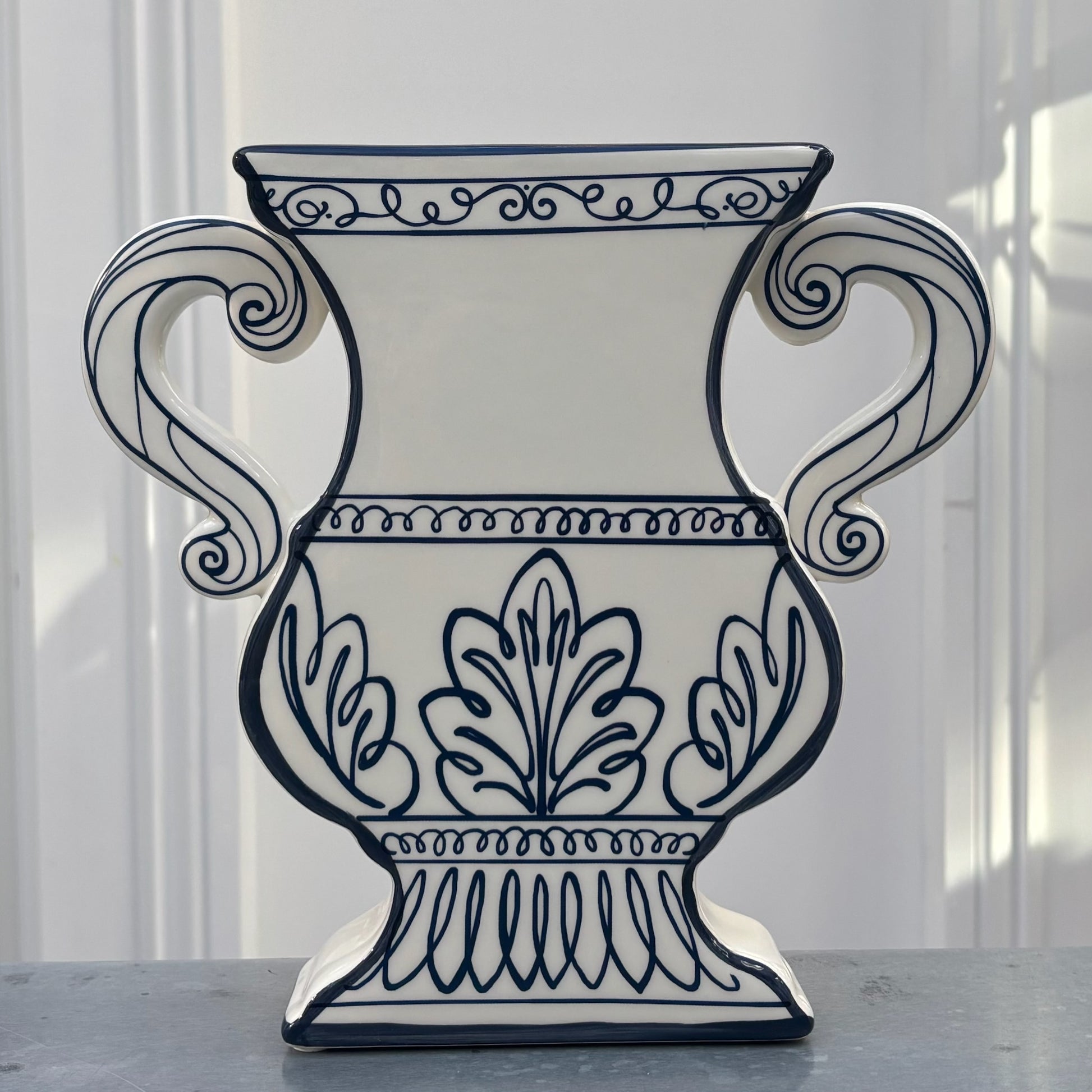 The fantastically unusual Flat Vase. A playful nod to the classic Greco-Roman form - blurring the lines between drawing and sculpture. Its navy contours look as if they've been sketched in midair, transforming the traditional silhouette of an urn into something both timeless and unexpected.