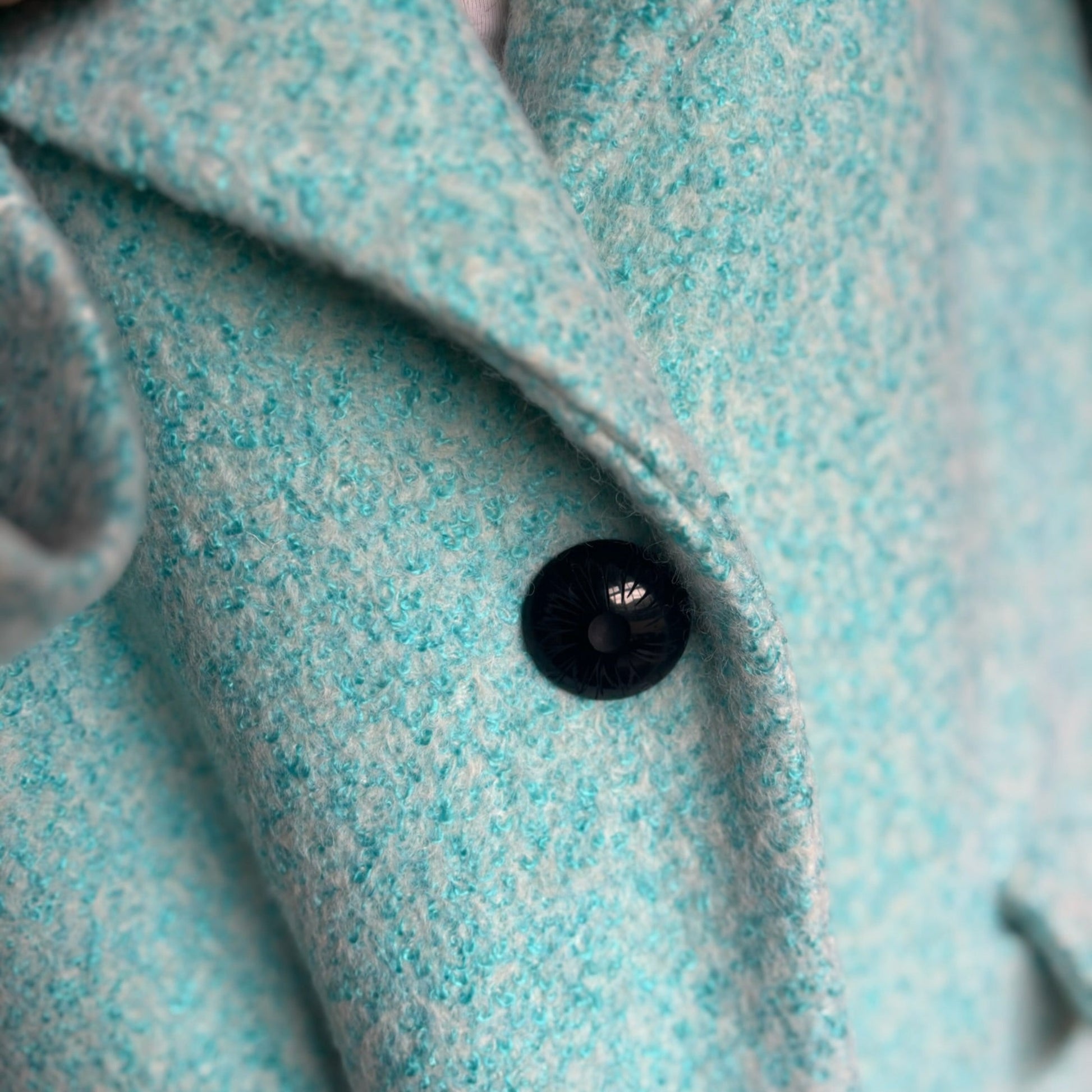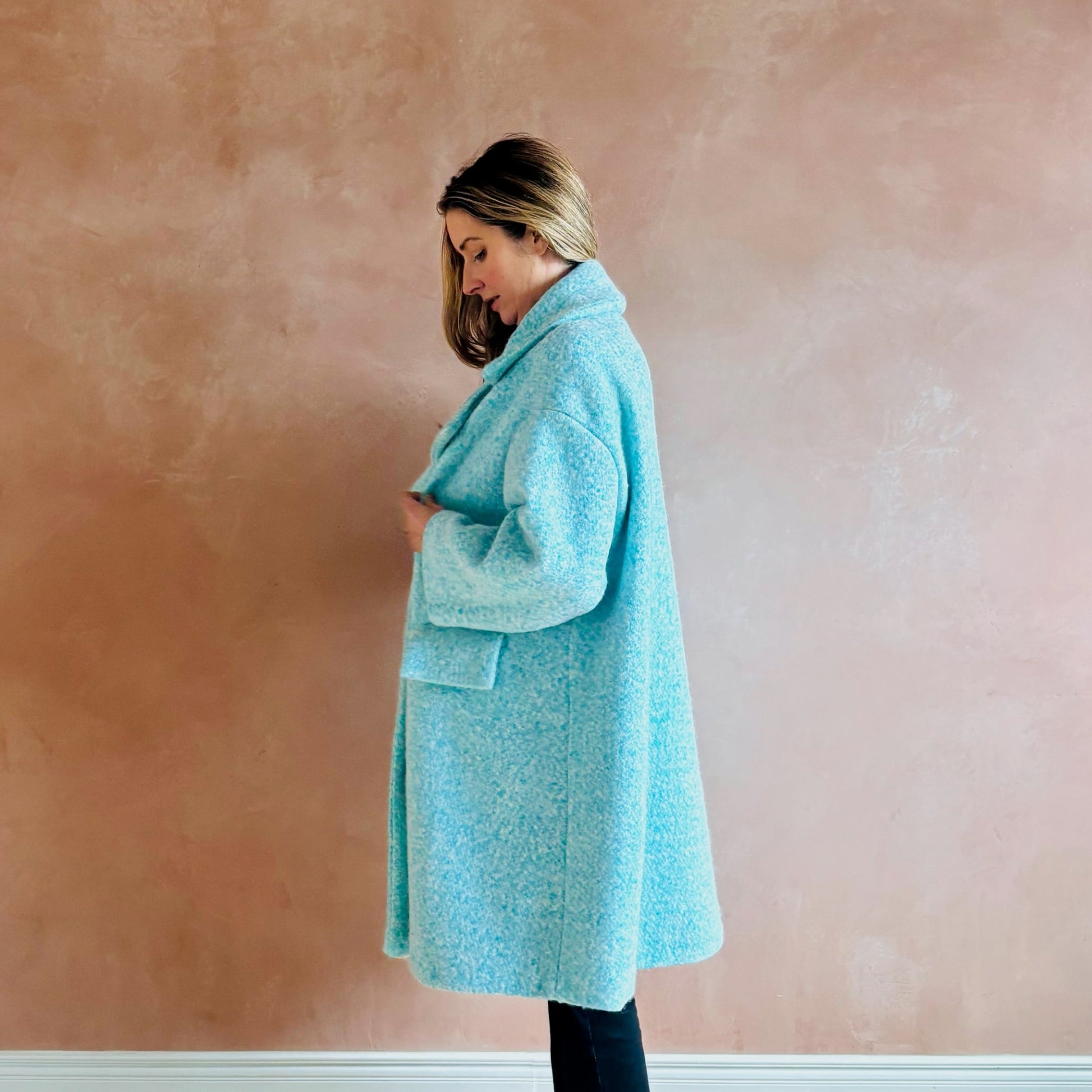 Glacier Blue Winter Coat. Stunning colour. Generous, easy to wear shape. Designed by Amanda P and made on site in Amo & Pax in Wicklow, Ireland by our wonderful machinist Colette. Single glossy big black button as closure. Side pockets. Gorgeous for your winter wardrobe.