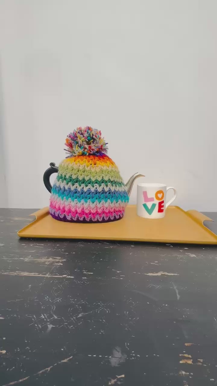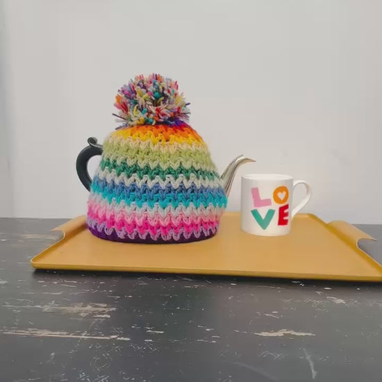 Multicoloured Hand Crocheted Tea Cosy complete with oversized bobble and fleece lining to keep your tea hot for longer.