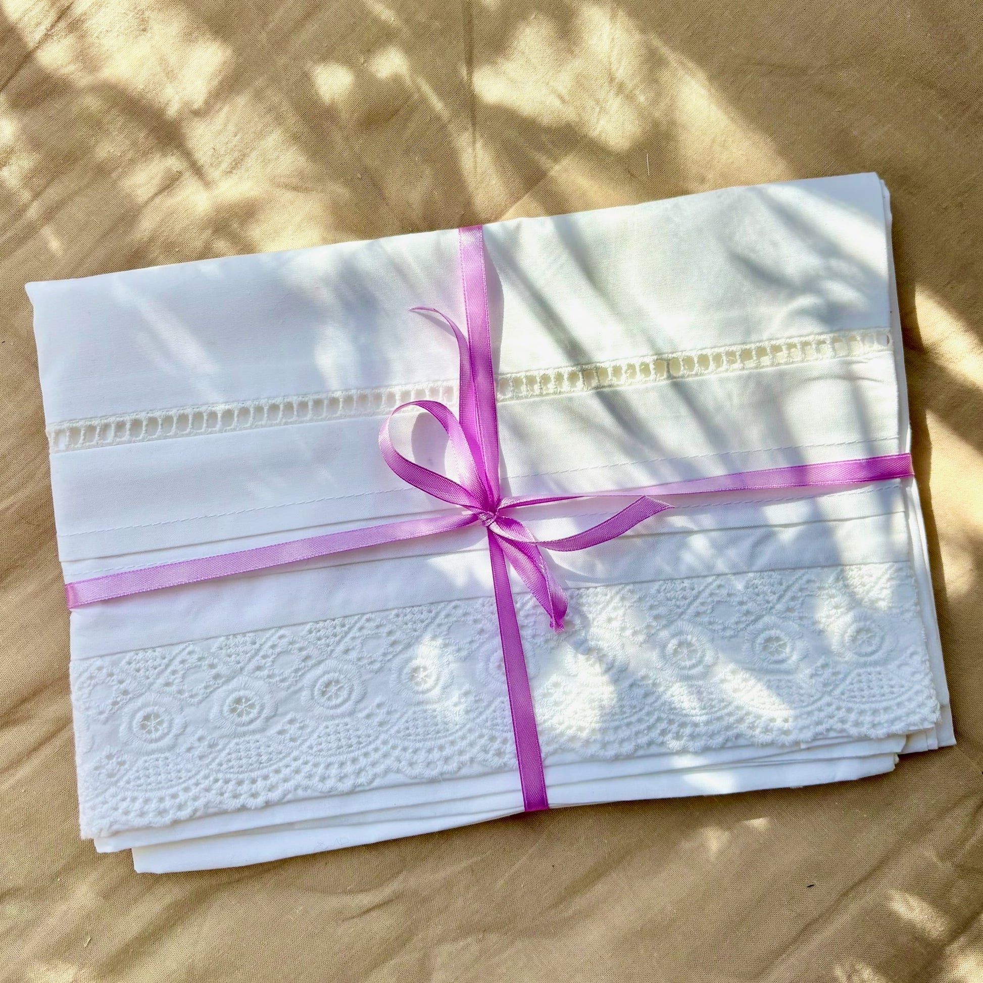 Beautiful White Cotton Pillowcase. Boderie Anglaise lace detail with tucks too. Super-soft and cool. From a responsible and sustainable source in India.