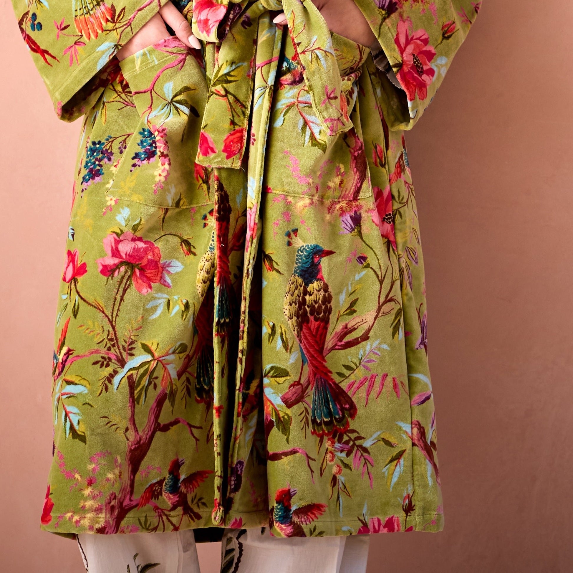 Luxurious lounging comes easy in this glorious Cotton Velvet Robe. With a fabulous Bird of Paradise print, large pockets and tie belt. Suddenly bedtime is just the excuse...